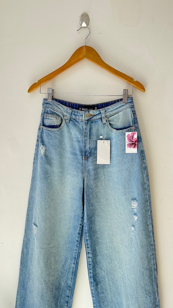 Jean 5 bolsillos recto de tiro medio y pierna holgada con detalles de roturas. Tiene largo al tobillo. Presenta un lavado con efecto quebrado
