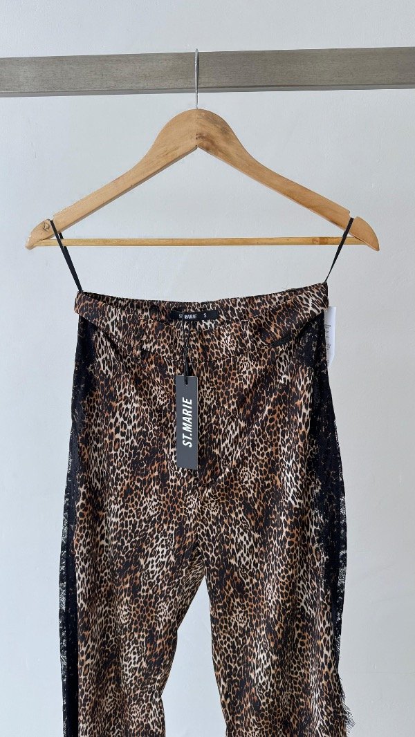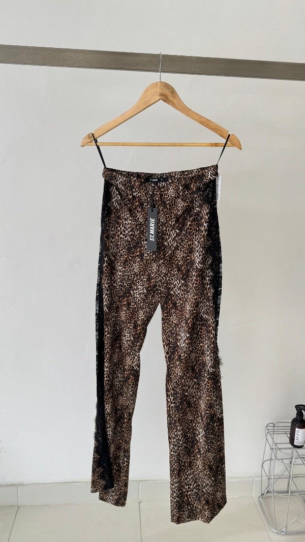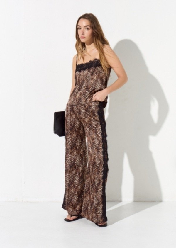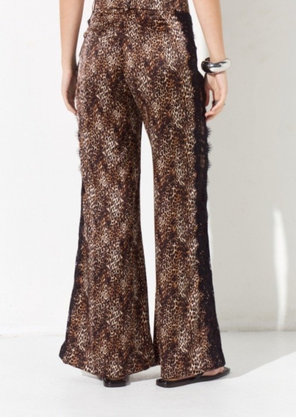 Pantalón confeccionado en seda animal print, con detalle de encaje en laterales.
