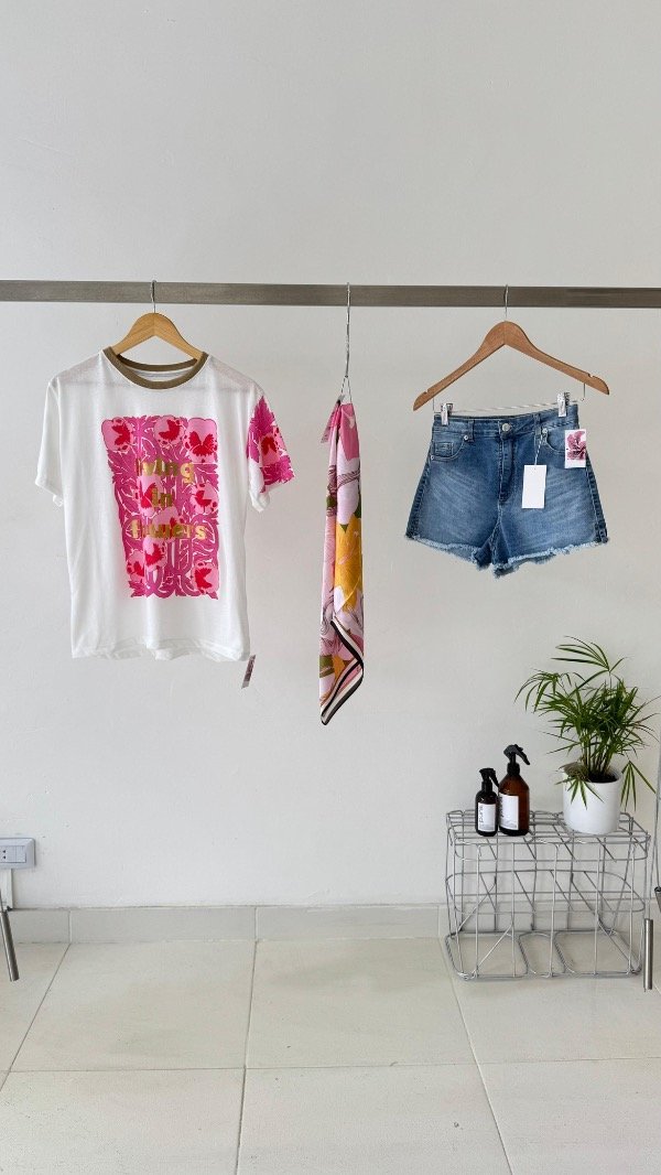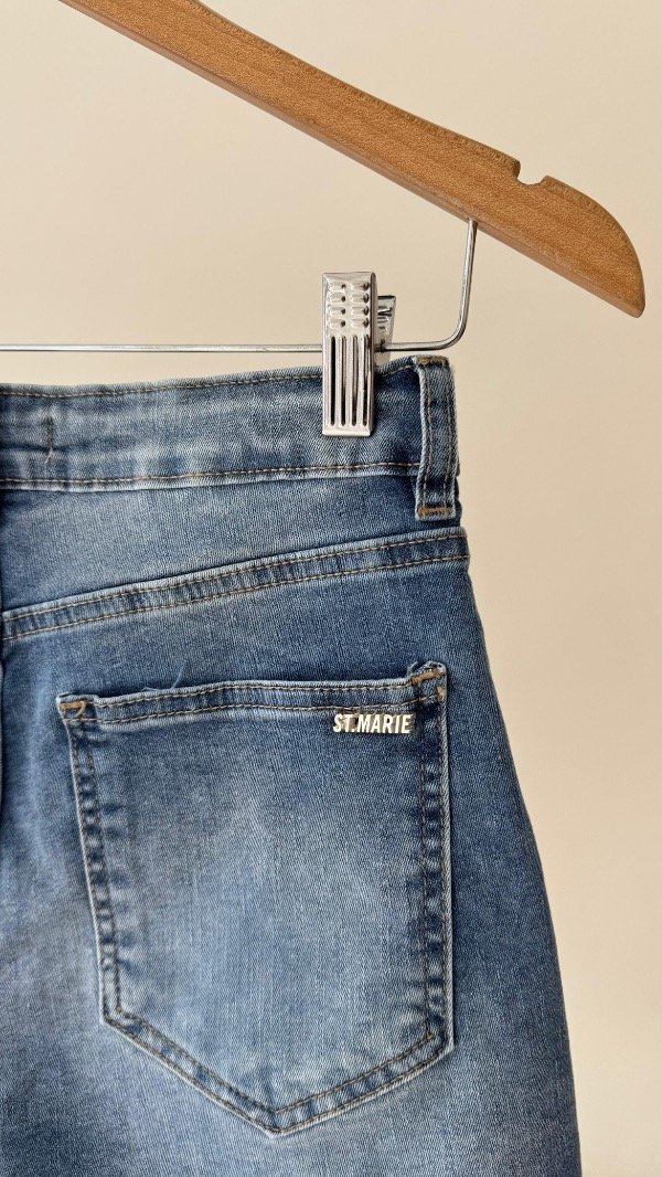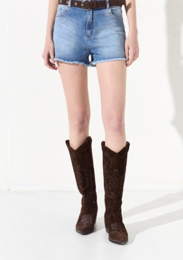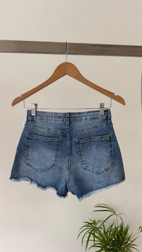 Short elastizado de cinco bolsillos con ruedo desflecado, en el bolsillo trasero lleva una chapita con la identificación de marca.