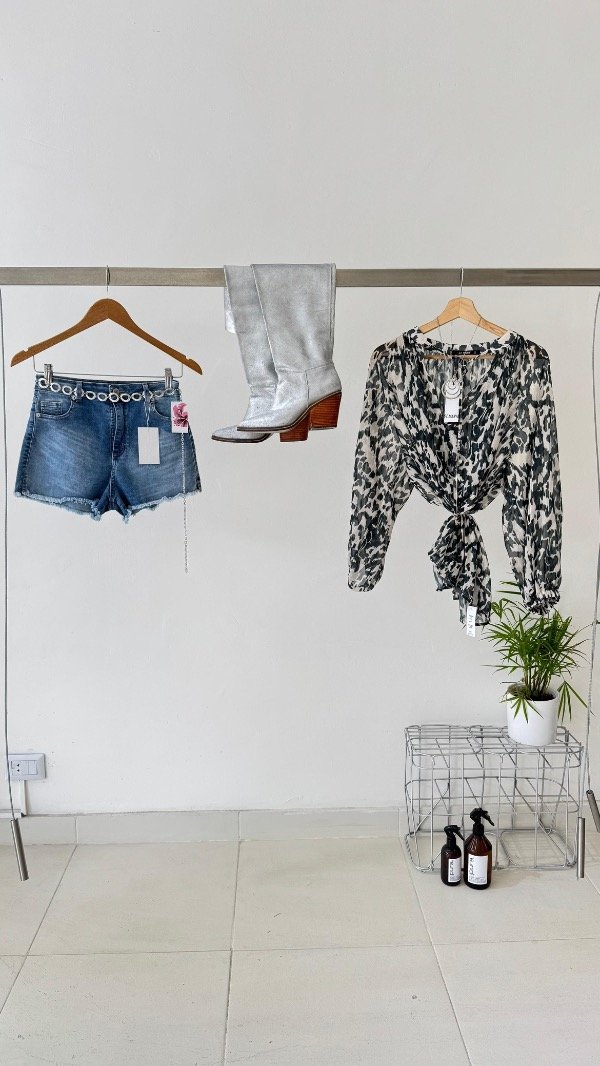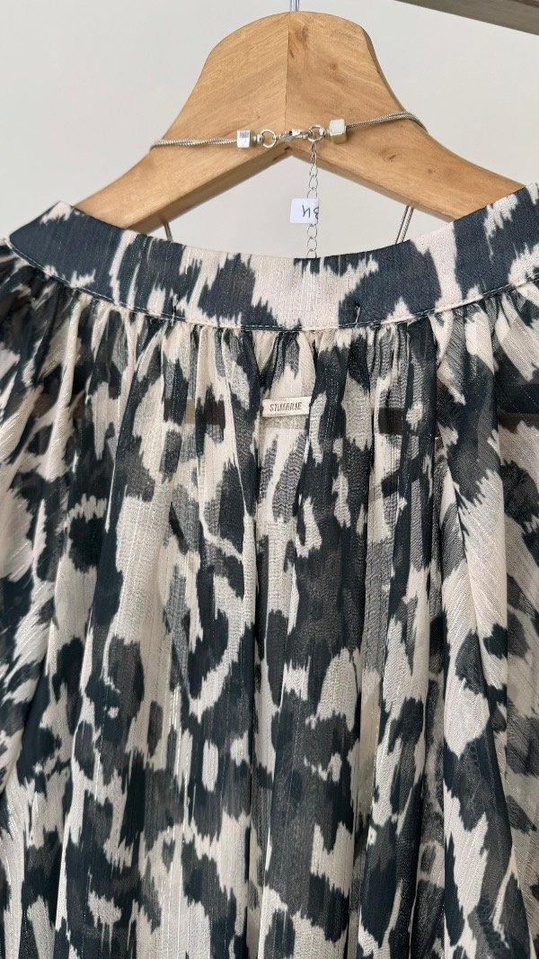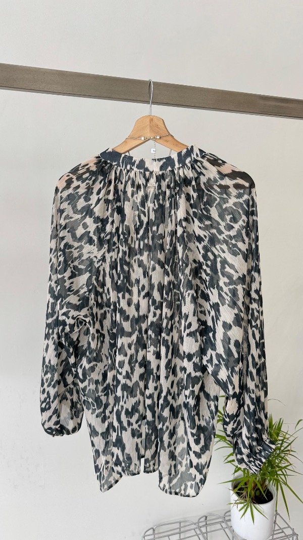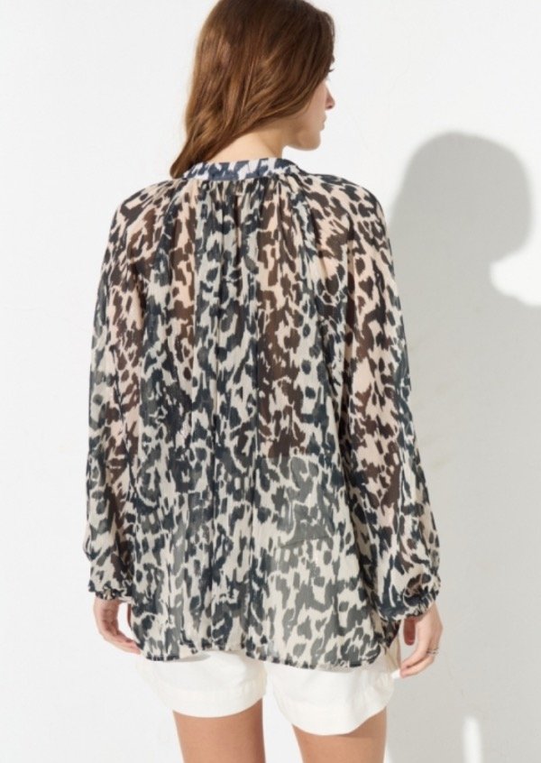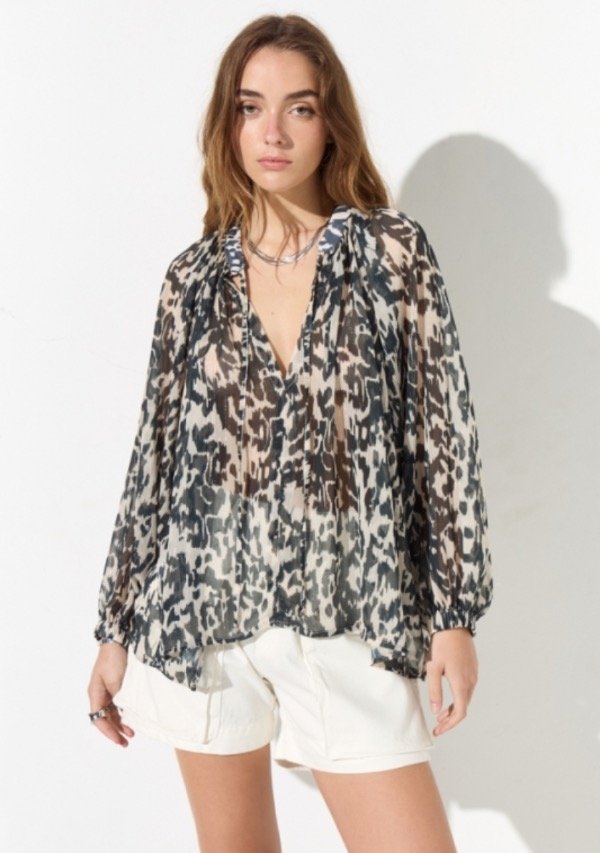 Blusa confeccionada en gasa estampada con detalle de hilados de lurex, de calce holgado y escote V.