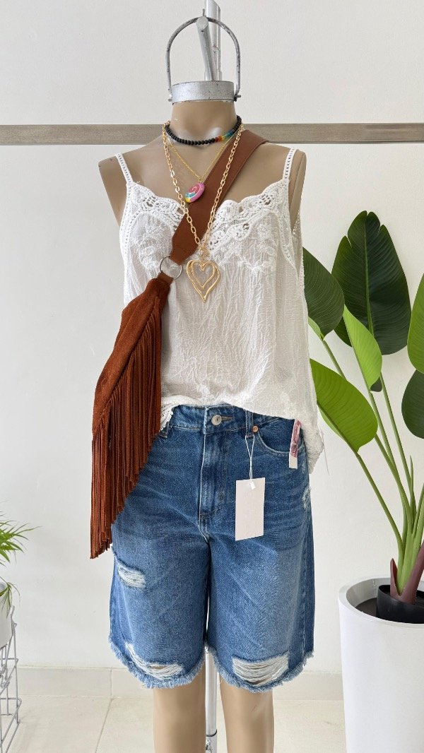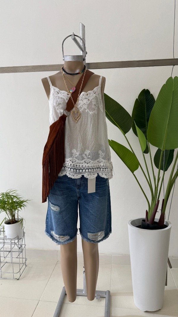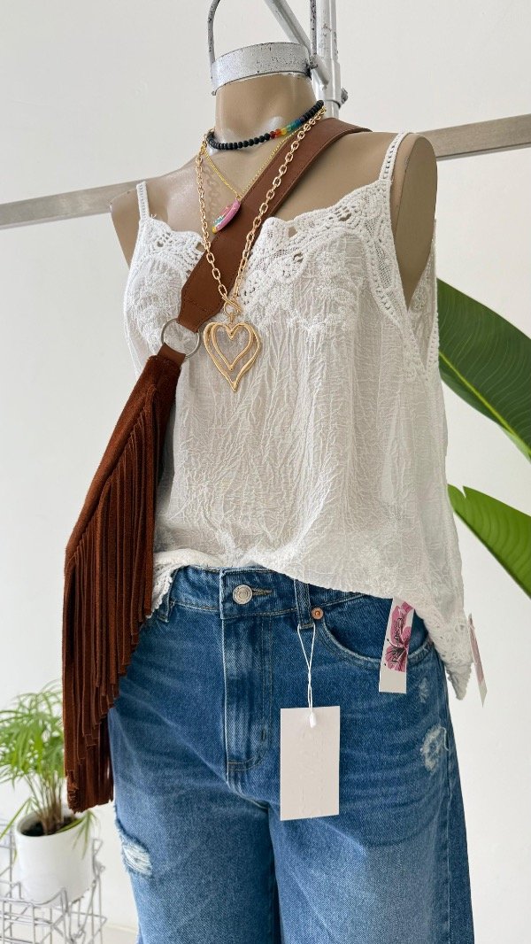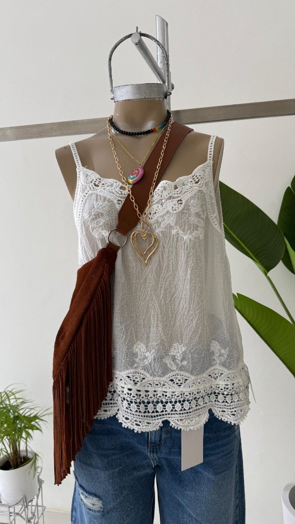 Musculosa de seda con detalles en crochet. Talle único, abarca de un S al L