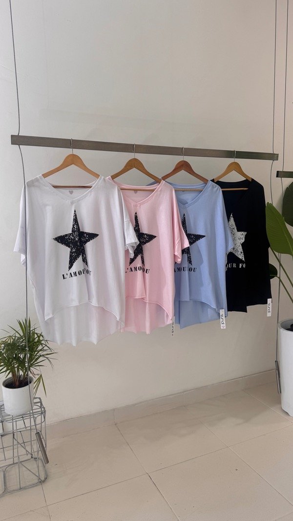 Remeron súper over de algodón escote en V con estampa de estrella con strass. Talle único, abarca de un M al XXL