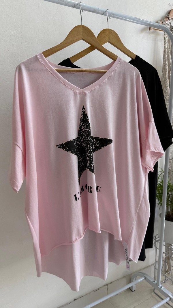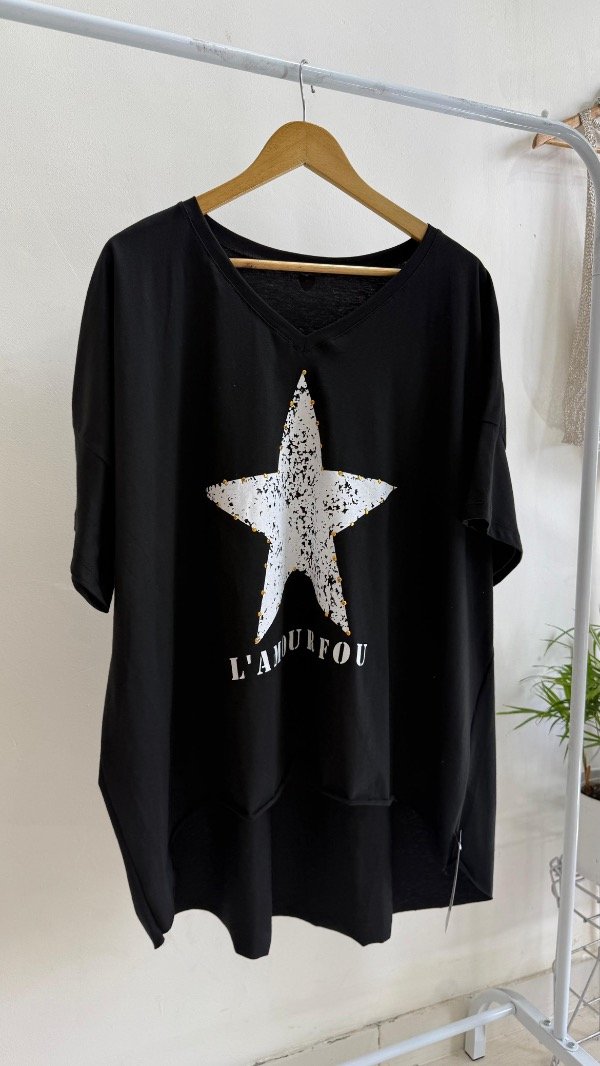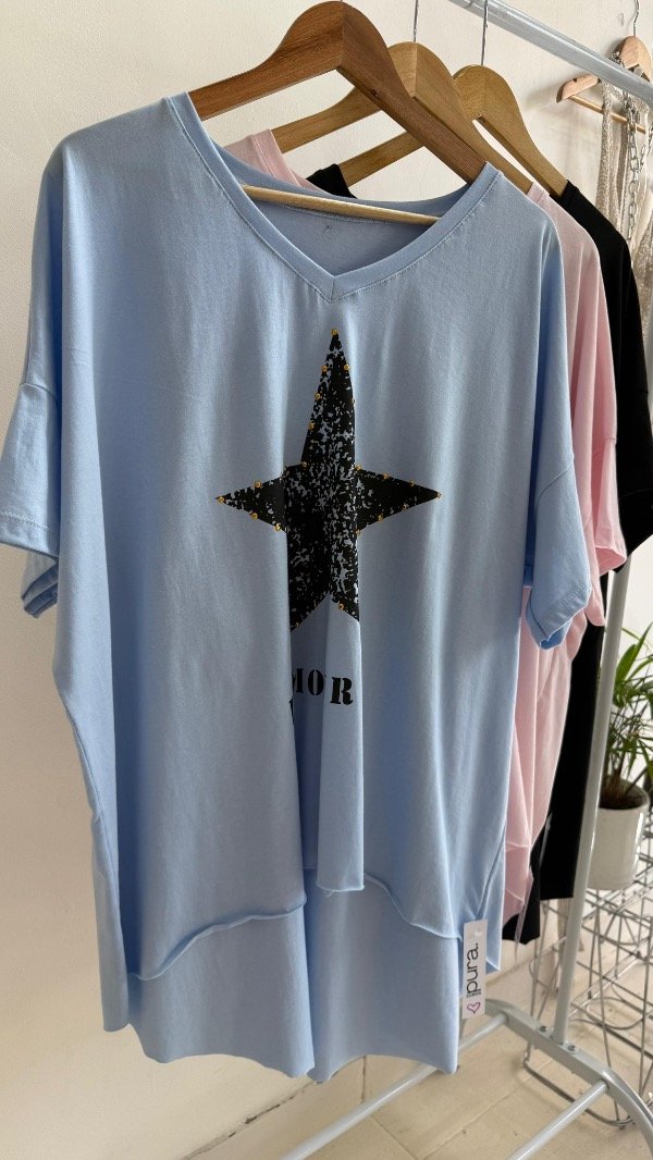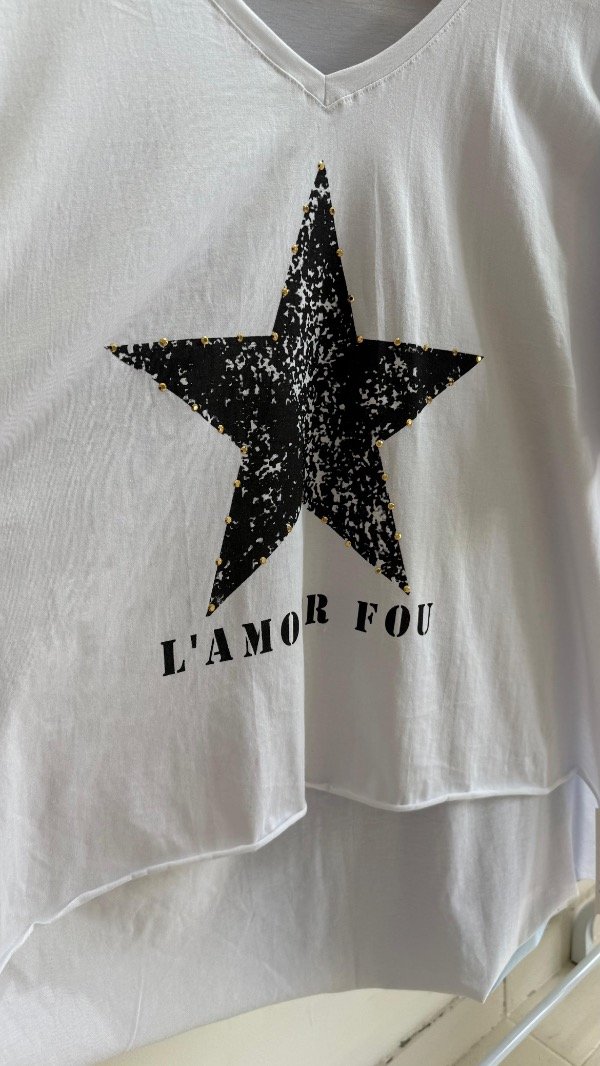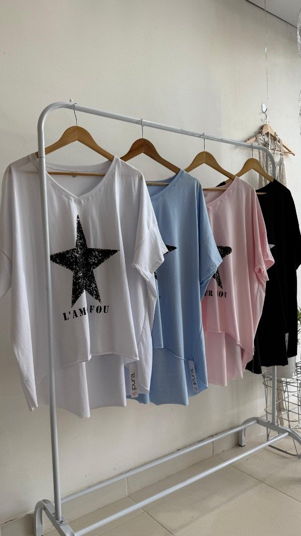 Remerón básico de algodón con estampa delantera y detalle de tachas. Talle único, abarca hasta un XXL