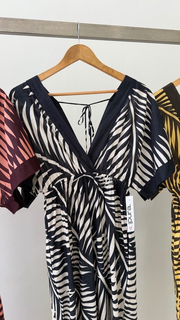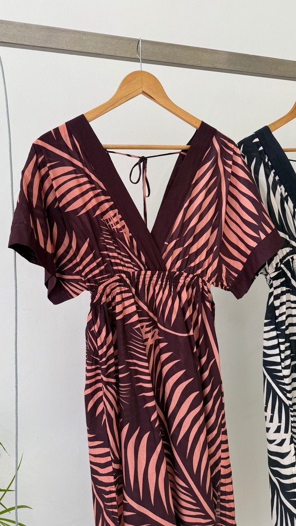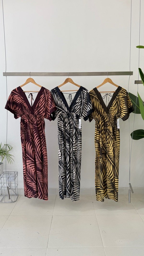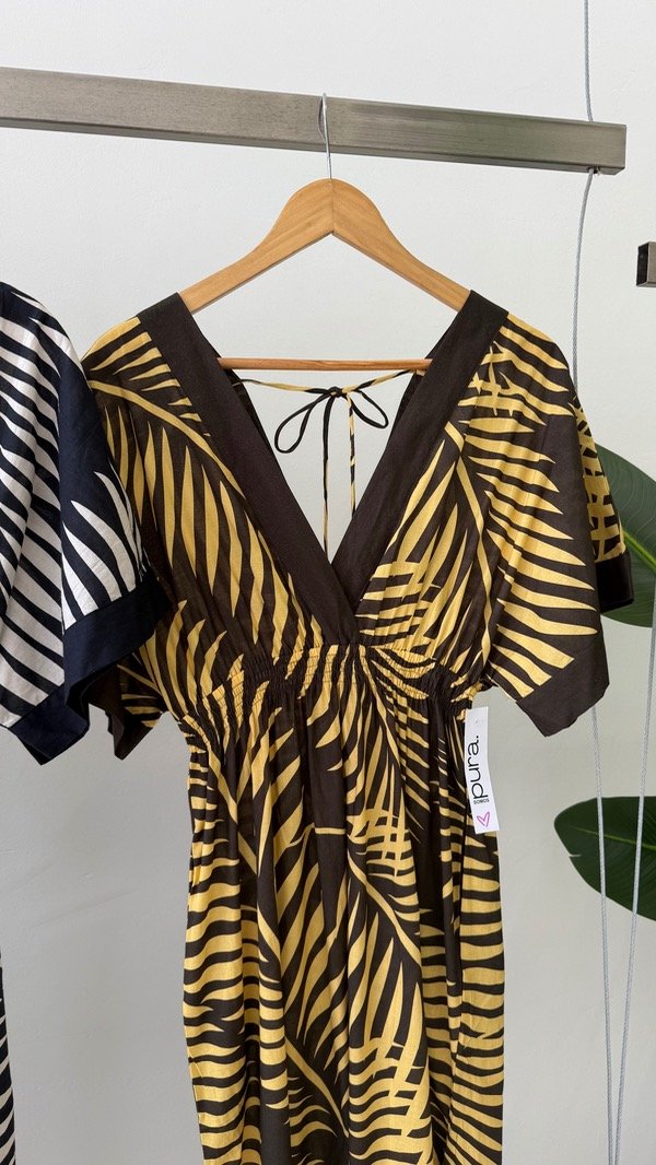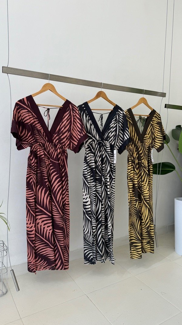 Vestido de rayón tipo kimono con mangas y lazo para regular en espalda, bolsillos y tajo lateral.