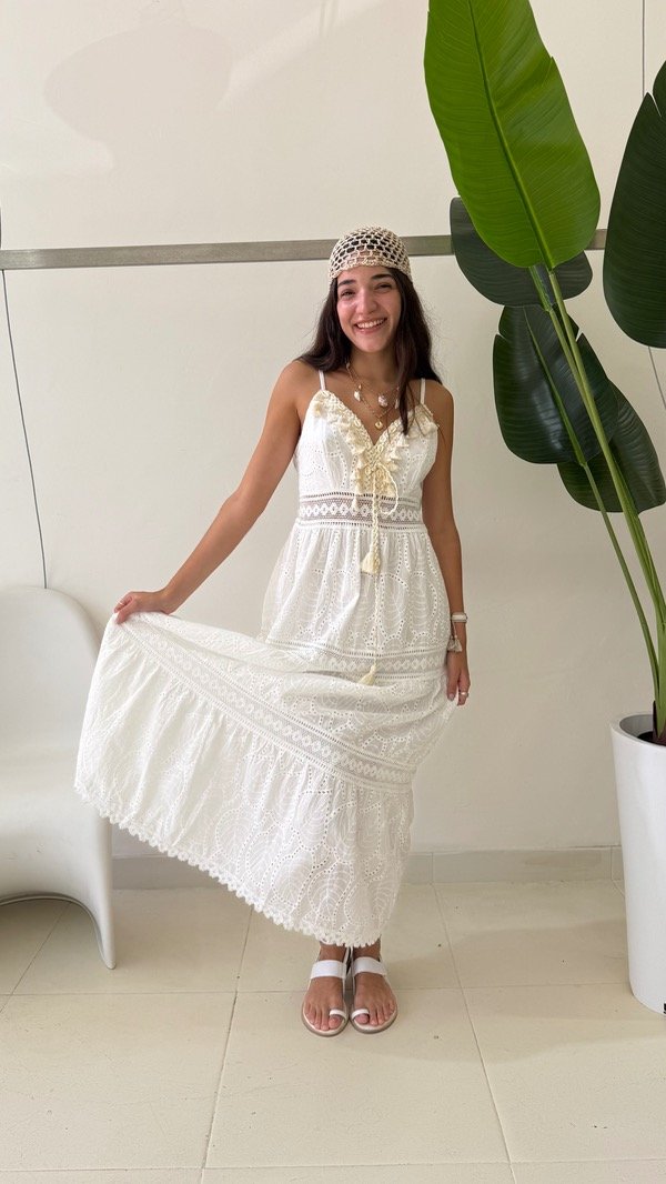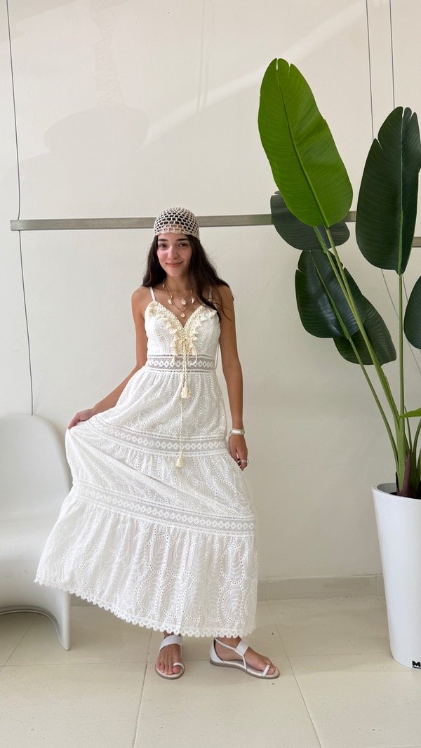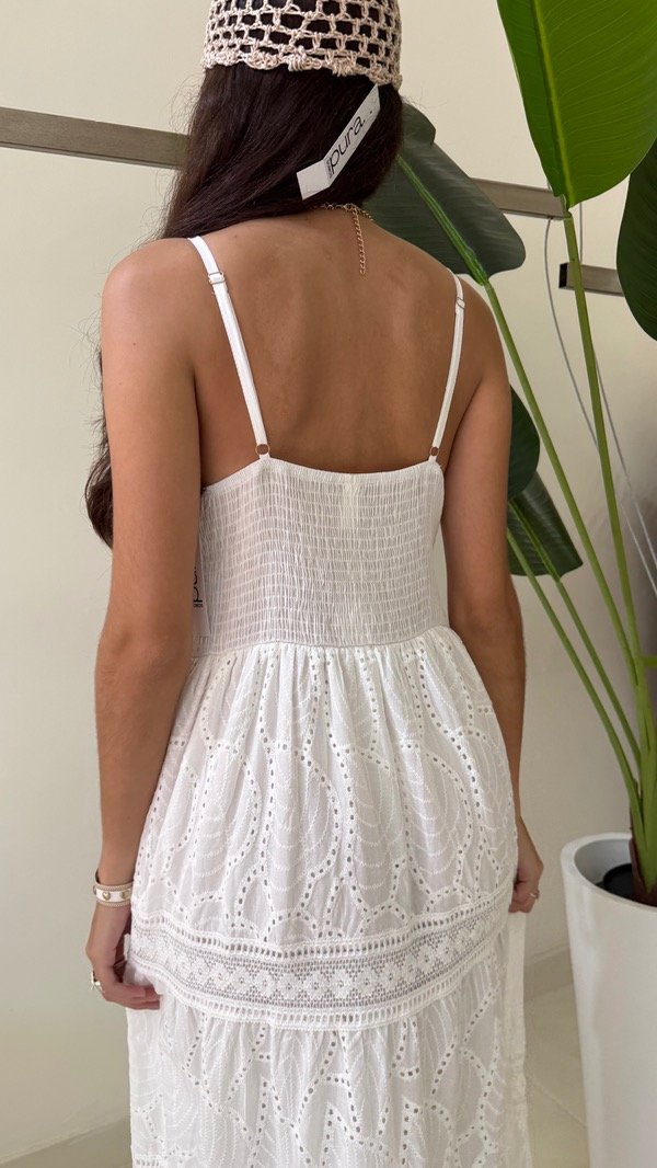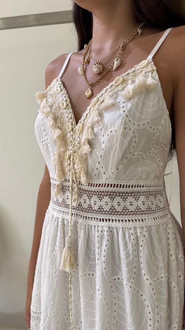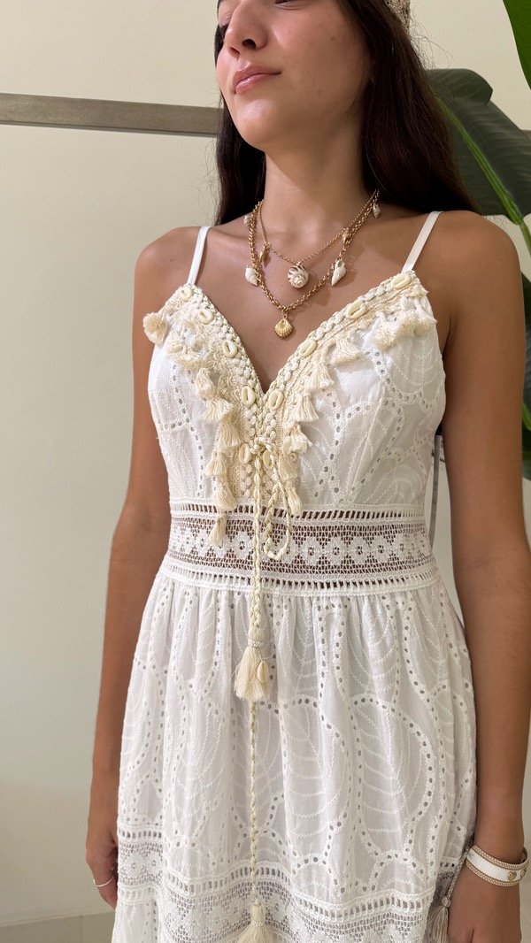 Vestido de bambula con puntilla y detalle en escote. Talle único, abarca de un S al L