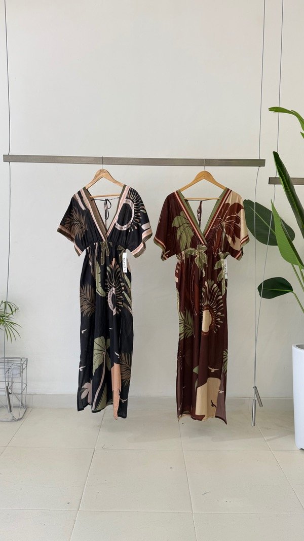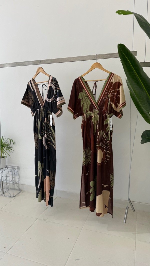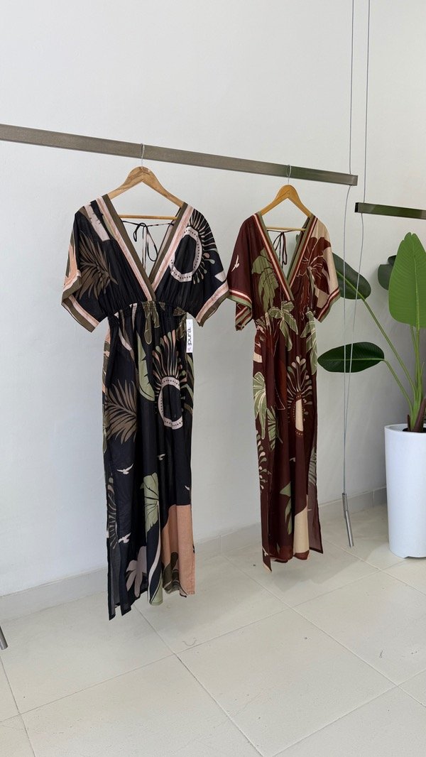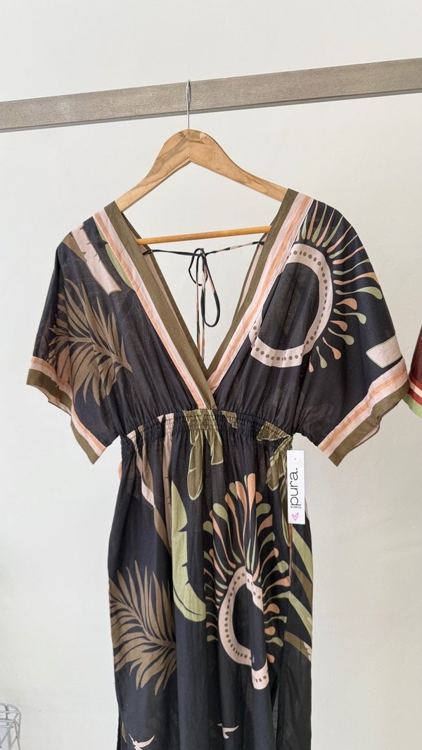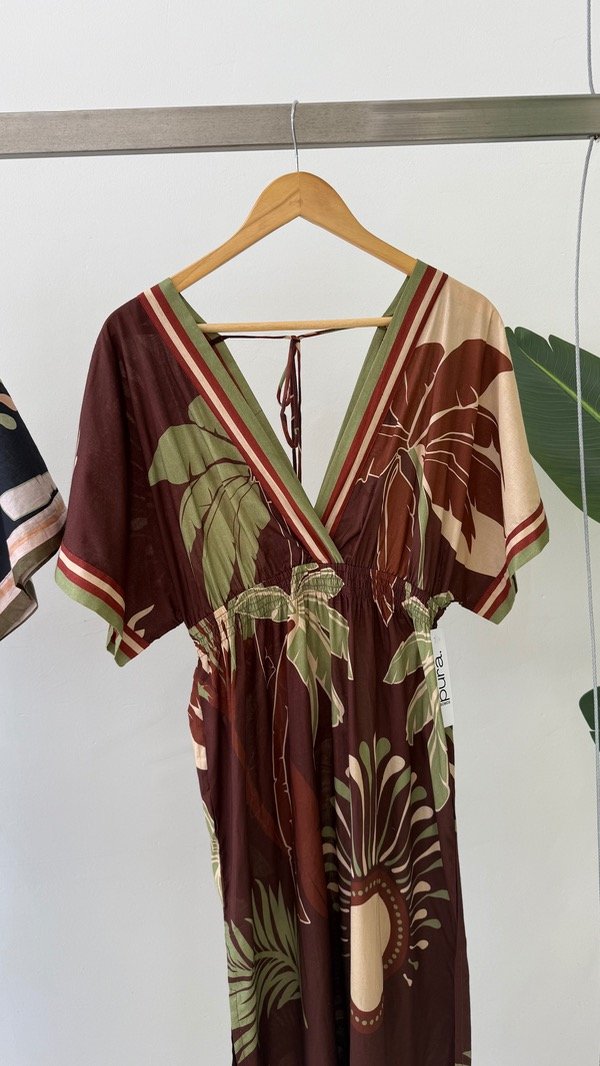 Vestido de rayón tipo kimono con mangas y lazo para regular en espalda, bolsillos y tajo lateral.